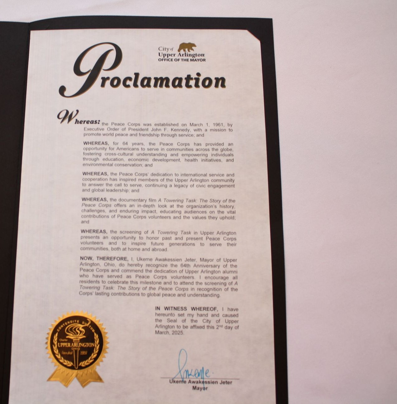 - March 2, 2025: The city of Upper Arlington, Ohio issued a proclamation recognizing the 64th anniversary of the beginning of the Peace Corps. The proclamation was presented at a program hosted by the Central Ohio RPCV Association.