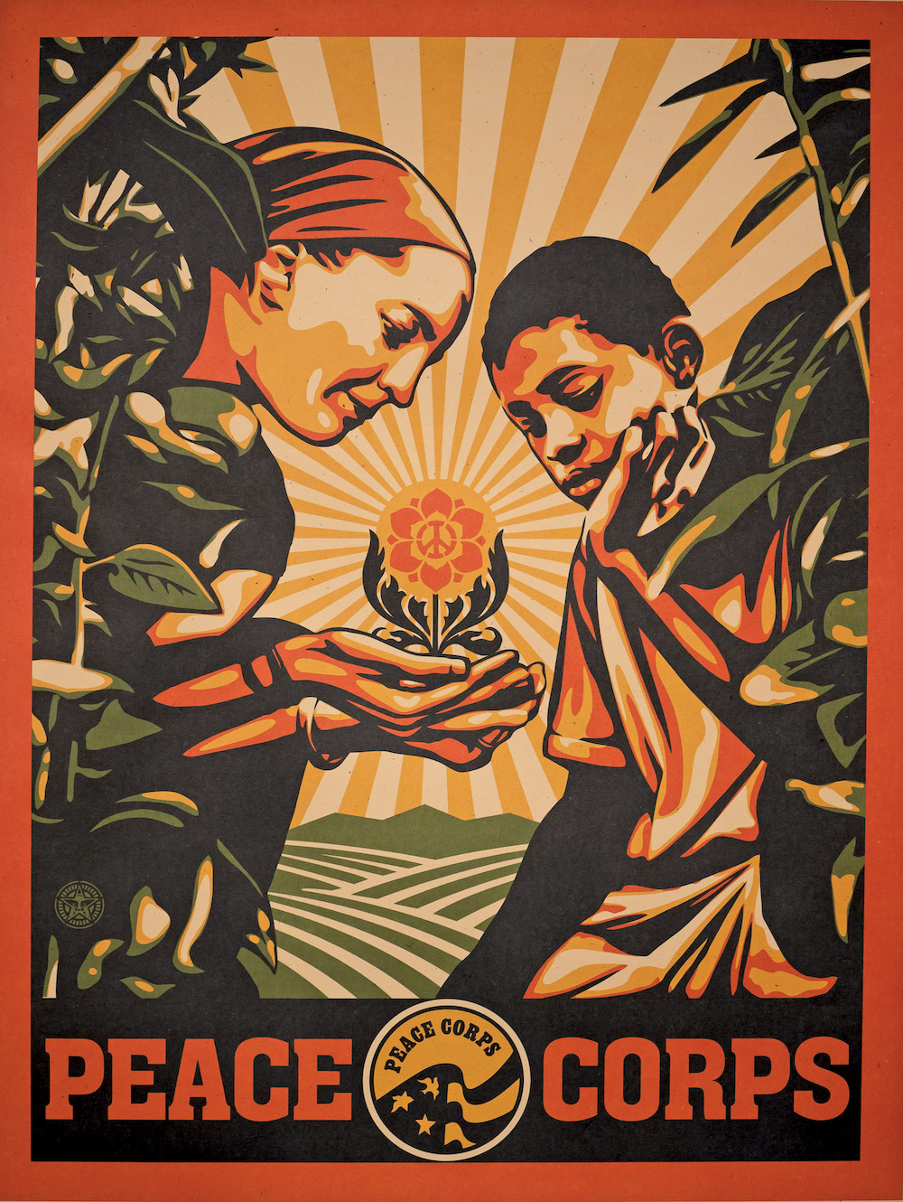 Out of the blue, we received a call from Peace Corps headquarters asking if we would visit with one of the Director’s representatives, who was to be in California the following week. She arrived with a specific ask in mind: Would we be willing to fund a commemorative poster which was being commissioned by the artist Shepard Fairey? We knew of Fairey’s work — both as a commercial artist and the creator of Barack Obama’s iconic poster for his recent presidential campaign.
