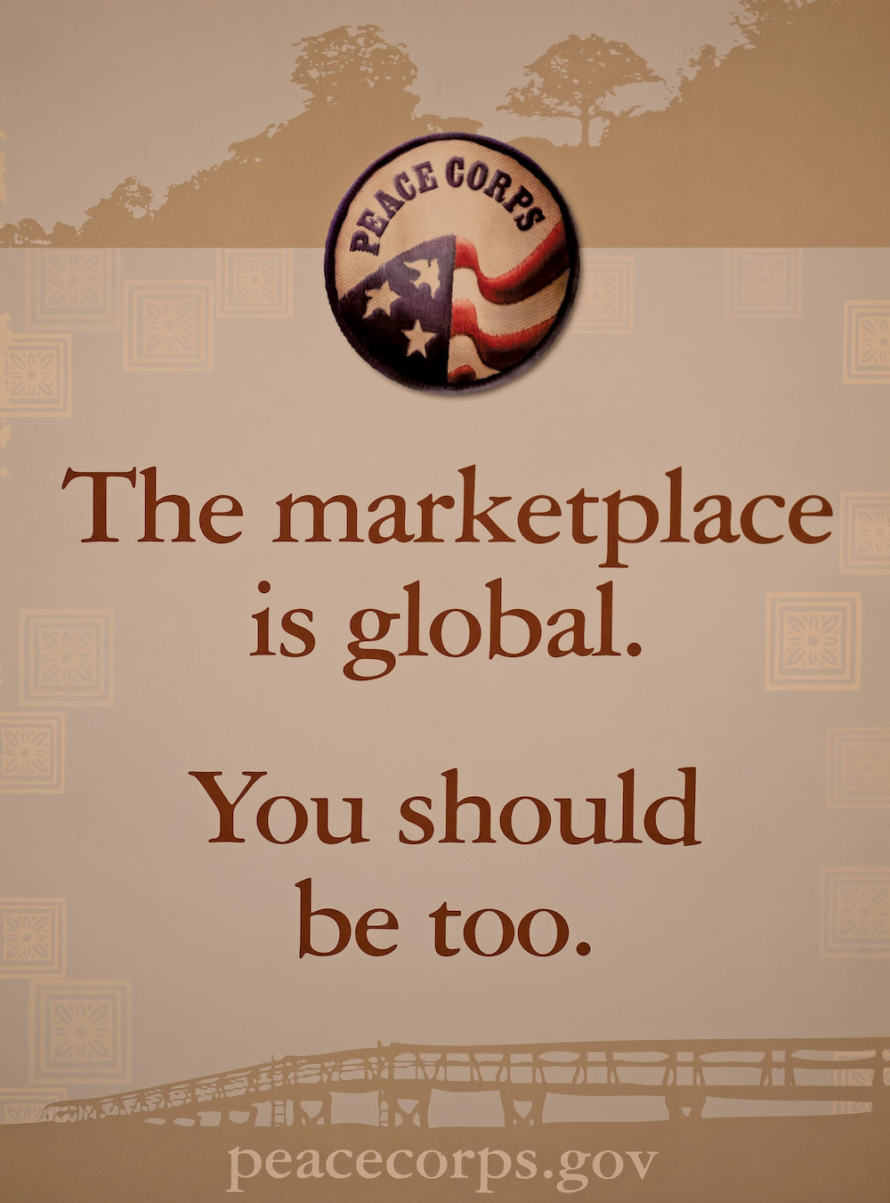 The marketplace is global. You should be too. Opening up my perspective to a world beyond just the borders I live within or the countries I claim has helped me realize just how small I am, and just how beautiful the experience is to humble yourself to the world. The Peace Corps has been a step for me in bridging these connections and expanding my conception of a global world beyond just the capitals of major countries, but into the heart of people from all walks of life.