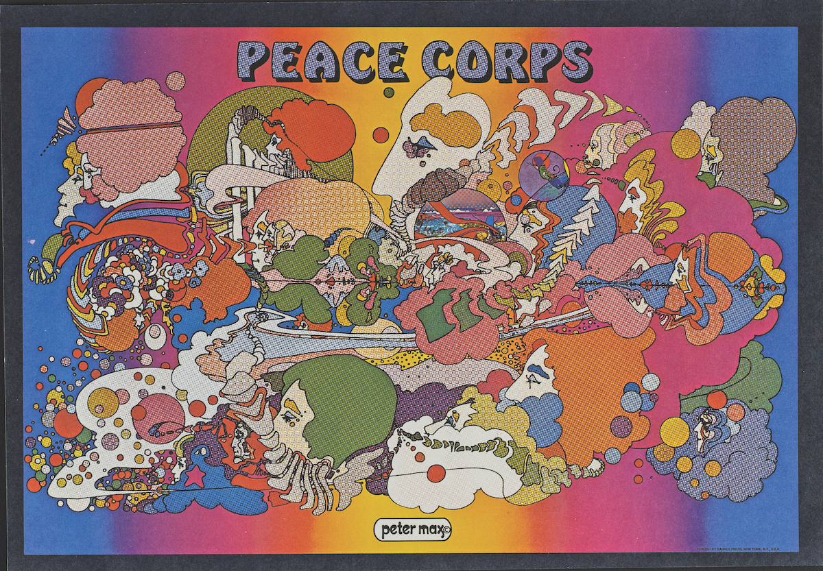 Recruiting on college campuses, I recall we had three versions of the posters with this Peter Max design. One was on poster paper with space at the bottom to note Peace Corps–related meetings, the location of the PC recruiting booth, classes that we were to speak to, etc. These disappeared almost as soon as we put them up, because the Peter Max painting was golden! A larger size simply advertised Peace Corps. It had a tendency to end up quickly in dorm rooms. Then there was the huge version, about four feet by six feet. These we only used in sealed displays or positioning that eluded pilfer. They were iconic, indeed.
