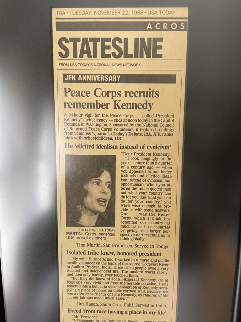 Also pictured in USA Today was Sally Timmel of Washington, D.C., who had served in Ethiopia and whose diary entry, dated November 22, 1963, was quoted: “Ron Kraus came through the door saying, ‘President Kennedy is dead.’ Our shouts of denial did nothing to make the moment seem any more real. I laid awake feeling sick, listened to the hyenas hollering … and the crying of sick children. The sounds of the world seemed to continue, but I felt that I not only had lost a rudder that gave us direction but lost a part of (myself).”