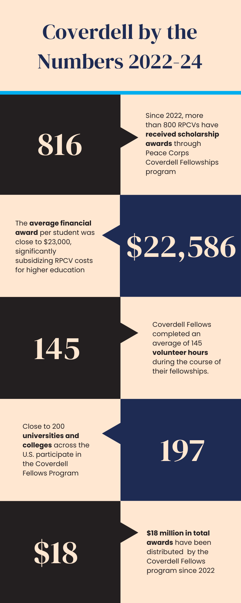 Universities incentivize RPCVs to enroll as Coverdell Fellows at their institution by providing Volunteers with financial support for their program of study. While Peace Corps does not directly provide financing, students can supplement their university’s financial support with federal work-study programs, grants, or other scholarship opportunities.