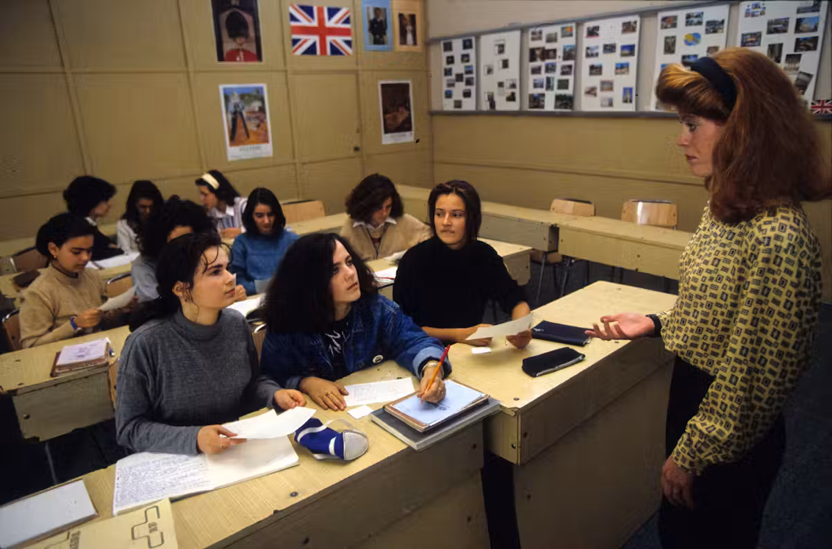 A Peace Corps volunteer teaches English to students in Bucharest, Romania, in the 1990s. Paul Conklin/Getty Images