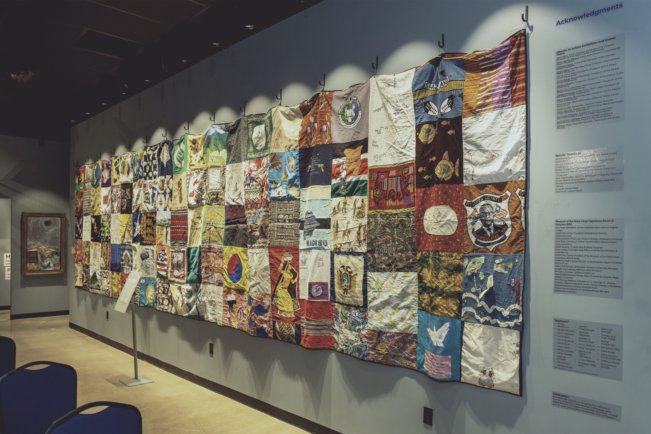 The exhibition also displays artifacts from the daily life of Volunteers along with what many visitors are calling the pièce de résistance of the exhibition, Patchwork of Peace (1990). The nearly 30-foot-long community quilt is a living tapestry of collective memory and cultural expression. Each block stitches together individual narratives transforming fabrics from across the globe into a powerful embodiment of social cohesion. The immensity of the tapestry is evidence of the lasting impact of the Peace Corps and host countries on the volunteers.