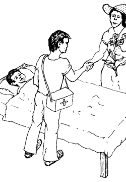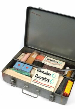 To assure that Volunteers had ready access to emergency medicine in the world’s remote and sometimes dangerous places, the U.S. Public Health Service issued medical kits to all serving Volunteers for their personal use. Thirty-five items were packed in each metal box. Contents included 100 Aralen tablets, 100 water purification tablets, 25 Band-aids, a small tube of Neosporin ointment, a thermometer, two ounces in insect repellant, a snake bite kit, a tourniquet, 50 tablets of Gantrisin, and five safety razor blades. Peace Corps prohibited Volunteers who had no training from using any of the kit’s contents to serve the health...